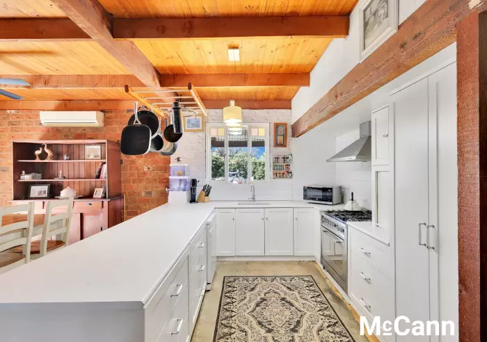 Inside the main residence, you will find an open plan, kitchen living and dining space. The kitchen is refreshingly modern, with ample storage and quality appliances that include a dishwasher plus a gas cooktop with range hood. There are plenty of design choices to be cherished from its history, including timber ceilings and brick walls, that will provide a perfect base for any further modernisation that you choose to implement.