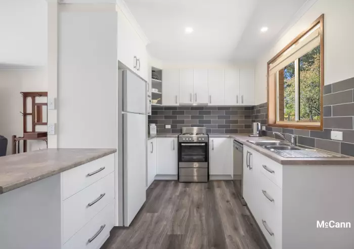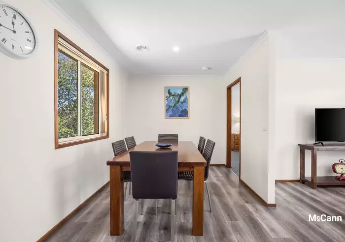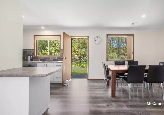 The home has been modernised with careful consideration to a timeless, neutral colour scheme. The kitchen includes good storage, with electric cooking and a dishwasher. The kitchen adjoins the dining space, where there is direct access outside. A semi-open plan design flows into the lounge with plenty of natural light and a sliding glass door that connects to a small, covered patio.