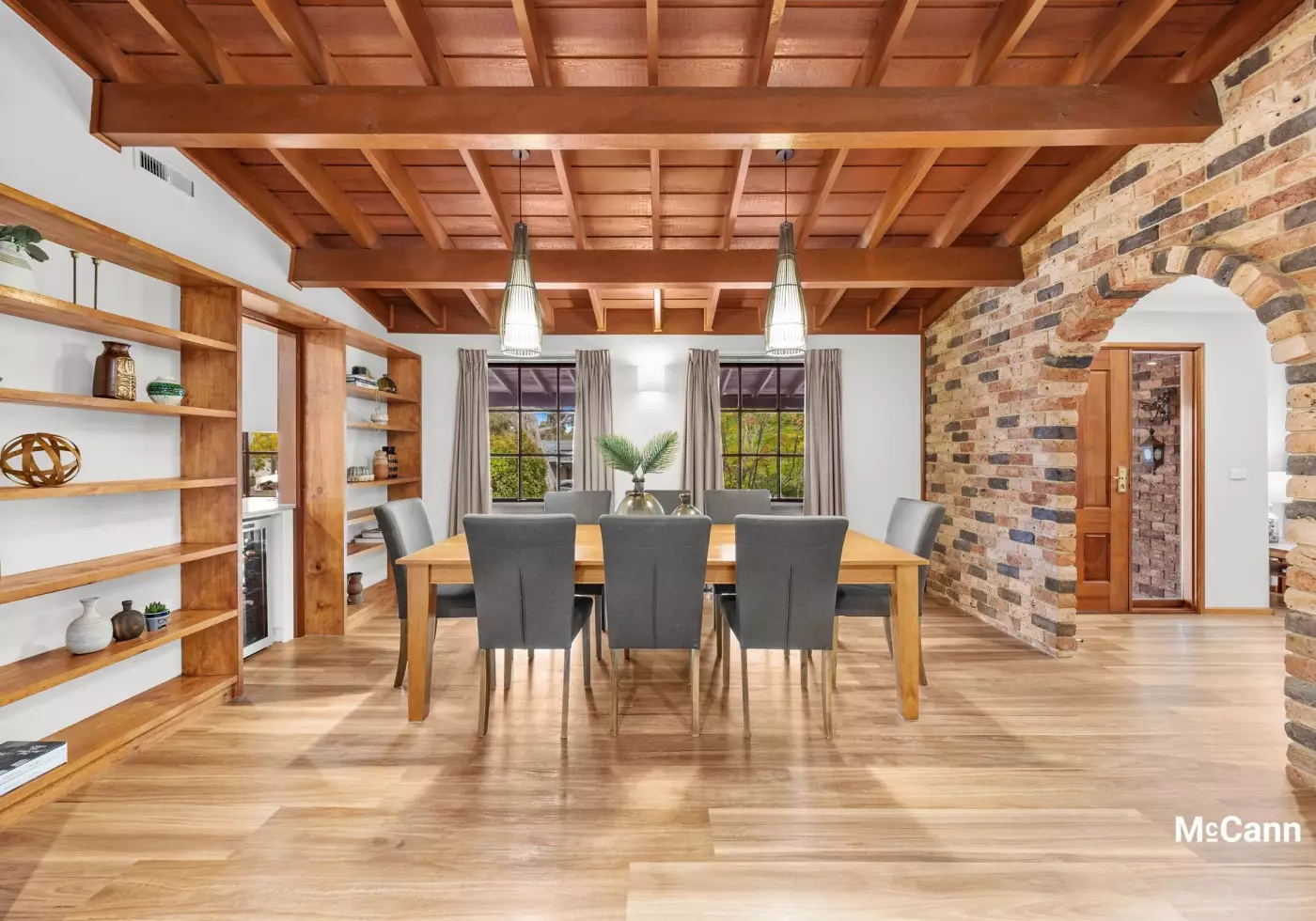 A clever peep-through servery-window connects the kitchen to the spacious, open plan family and dining area that showcases stunning architectural features including raked timber ceilings and a feature brick wall with archway leading into the lounge room. Large windows let in plenty of natural light and provide a leafy, garden outlook from each space.