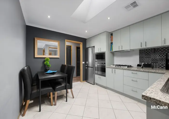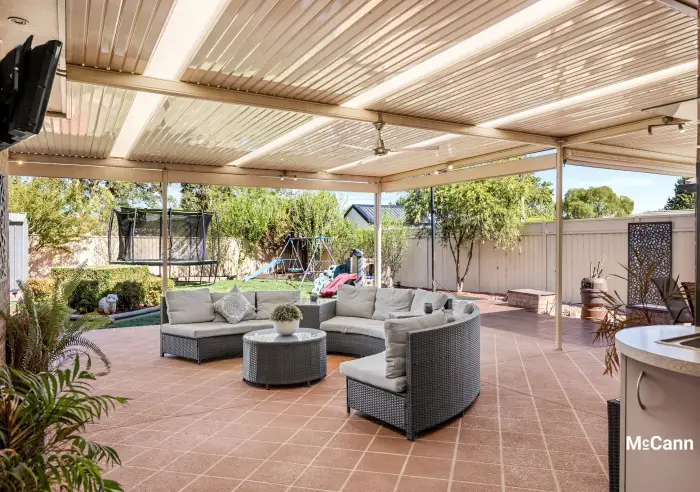 The central kitchen occupies its own space, with an incorporated meals area and effortless flow to the adjoining living space. Modern, with stone-look bench tops, plenty of storage and a skylight, the kitchen window offers a convenient view of the outdoor entertaining area and is equipped with high-quality appliances, including a dishwasher, electric oven, and gas cooktop. Sliding glass doors provide easy access to the thoughtfully designed, fabulous entertaining zone. Suitable for year-round use thanks to the clever incorporation of roller blinds and an outdoor ceiling fan, the covered space truly enhances all-season outdoor living.
