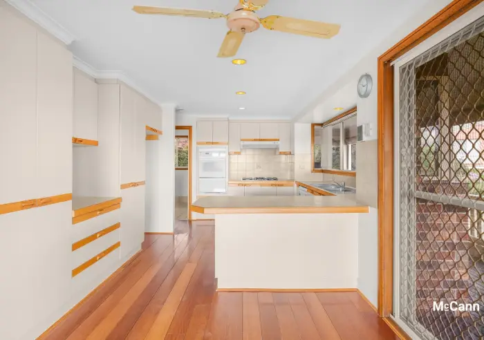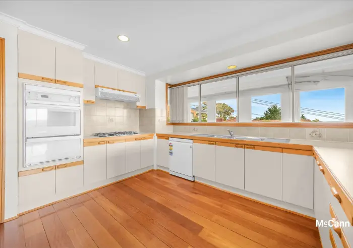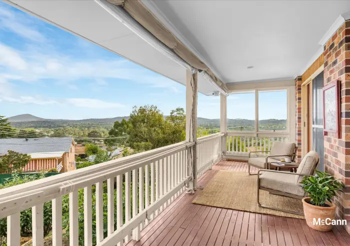 The kitchen is spacious with plenty of storage options, good work surfaces, and potential to add value through modernisation. Quality appliances include a gas cooktop and an updated LG dishwasher. There is a ceiling fan for comfort and stunning timber-look floors that flow into the adjoining family room. Here, large windows take in sweeping mountain views, and there is direct access to the elevated entertainment deck, which can be partially enclosed with bistro blinds and complemented with a rug on the floor for year-round enjoyment.