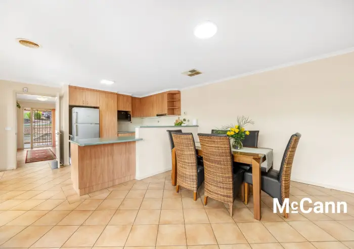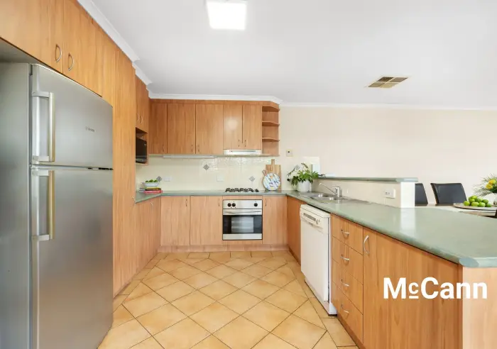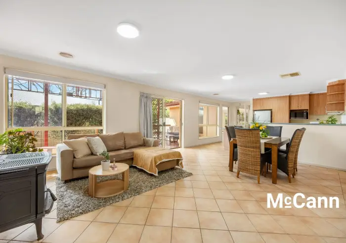 The kitchen provides an efficient design, with good storage and quality appliances including a dishwasher and gas cooktop. The kitchen overlooks the adjoining dining and family room that is generous enough to be furnished into zones with a cosy fireplace to enjoy during the cooler months.