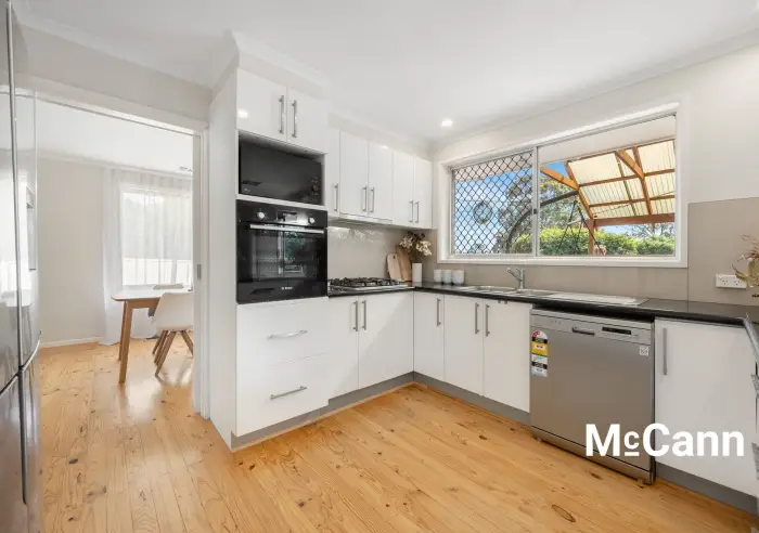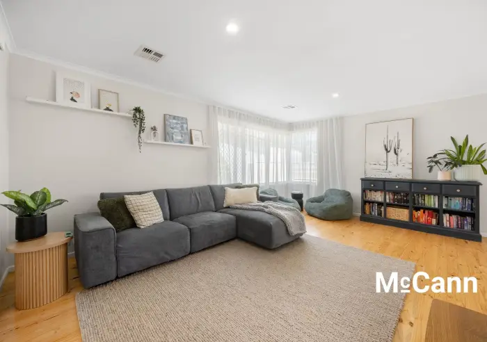 As you enter the home, you are welcomed into a formal entranceway, that separates the living spaces from the four bedrooms. Timber flooring flows through the living spaces, where you will find a generous, L-shaped living and dining room, with excellent lighting that includes dimmable downlights.